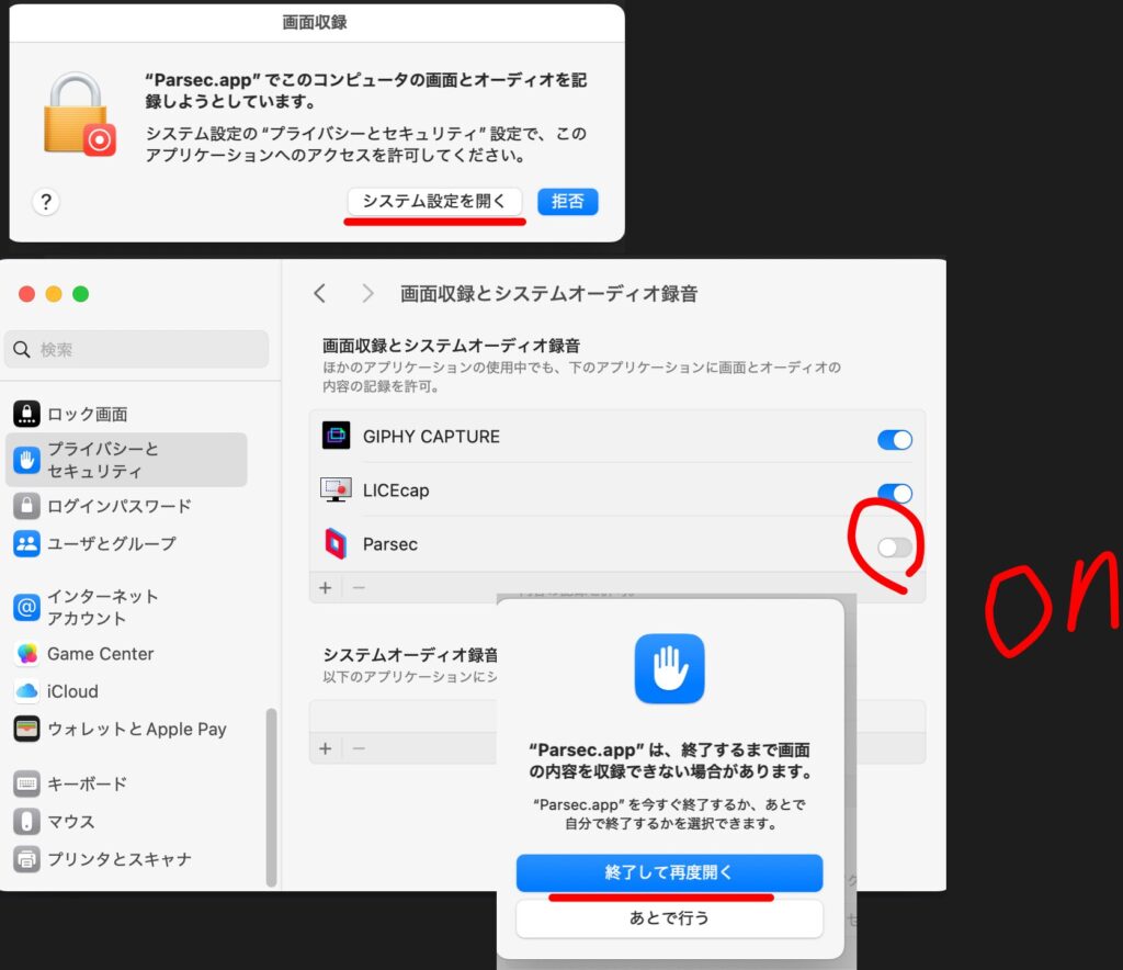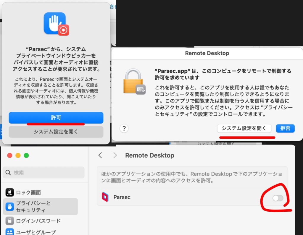 起動すると許可〜というのが出てくると思うので設定を開くでParsec系のボタンを全てONにしていきます。