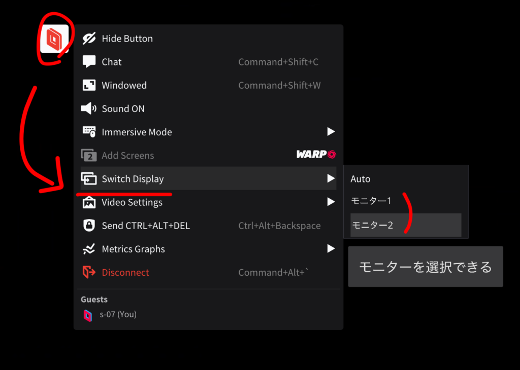Parsecのアイコンをクリックして「Switch Display」からモニター選ぶことができます。