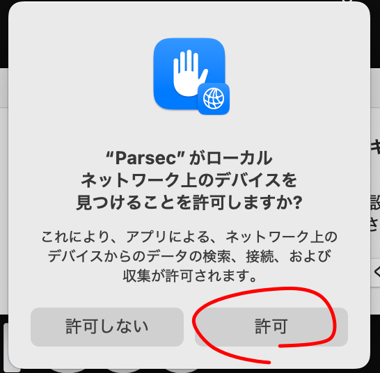 初回起動時に「ローカルネットワーク上のデバイスに〜」と出ますので一応「許可」に。